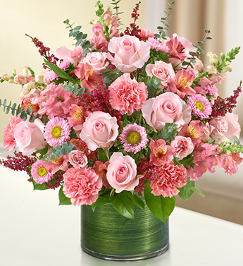 PW007- Our color-soaked, all pink arrangement of roses, spray roses, snapdragons, alstroemeria, carnations and more is tastefully arranged in a glass cylinder vase to offer a comforting message.