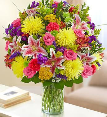 BT008- Graceful, bright-toned arrangement of roses, stock, alstroemeria, carnations, daisy poms, mini carnations and monte casino, gathered with variegated pittosporum and spiral eucalyptus.