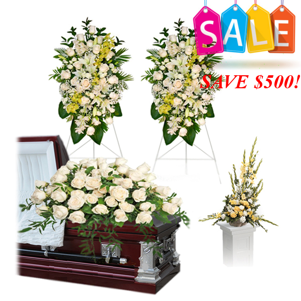AP004- Beautiful fresh flower package arranged with yellow and white roses and assorted flowers throughout. Approximate sizes: in Inches 26H x 56W for Casket, 48H x 46W for each Standing Spray, and 52H x 42W for Sympathy stand.
