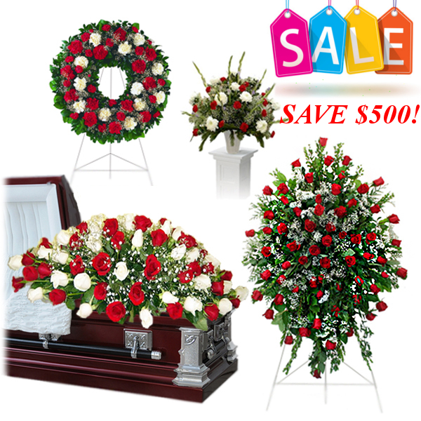 AP005 Beautiful fresh flower package arranged with red and white Roses, carnations and mixed flowers throughout. Approximate sizes: in Inches 26H x 36W for Casket, 48H x 46W for Standing Spray, 26 circle for Wreath, and 35H x 42W for Sympathy stand.-