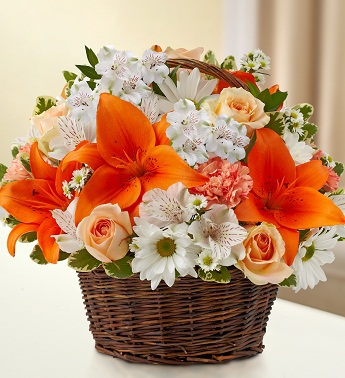 PE007- Offer a beautiful blessing for a life well lived with this graceful arrangement of peach, orange and white blooms. Hand-gathered in an elegant basket and accented with a beautiful pair of dove picks, it’s crafted from fresh roses, lilies, alstroemeria, carnations and more. Graceful peach, orange and white arrangement of roses, lilies, alstroemeria, carnations, daisy poms and monte casino, accented with variegated pittosporum and myrtle Hand-arranged in a willow handled basket with a pair of peaceful white dove picks; basket measures 8H Appropriate to send to the home of friends and family members or to the memorial service Large arrangement measures approximately 12H x 12L