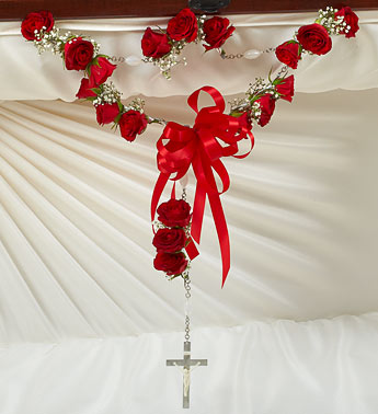 RE019- Express your faith and love with this inspiring and beautiful floral tribute. Features 20 stems of attractive red roses draped around a string of rosary beads Accented by Baby’s Breath and finished with a satin ribbon Traditionally sent by children or grandchildren directly to the funeral home Our florists use only the freshest flowers available so varieties and colors may vary Measures approximately 24W
