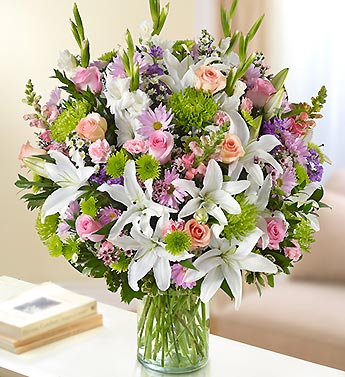 PS006- Remember a loved one who has passed on with a stunning tribute arrangement. Lush, pastel-toned arrangement of roses, lilies, gladiolas, stock, spider mums, poms, snapdragons, mini carnations, daisy poms, monte casino and waxflower, accented with variegated pittosporum, salal and myrtle.
