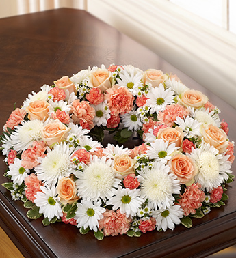 PE014- Comforting table wreath arrangement in peach, orange and white includes lilies, roses, carnations, daisy poms, mini carnations and monte casino, accented with variegated pittosporum and leather leaf Hand-crafted by our select florists to be sent to the cremation service to honor friends or family members Also appropriate for smaller memorial services in the home The cremation urn or a framed photograph can be placed in the center to present a lovely tribute at the service or home Large arrangement measures approximately 22H x 22L