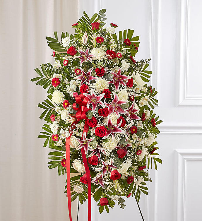 RE007- This Sympathy Standing Spray, in red and white, beautifully reflects your love and compassion. Red and white flowers such as roses, hybrid lilies, carnations and more An appropriate gift for family, friends and business associates to send directly to the funeral home Our florists use only the freshest flowers available, so colors and varieties may vary Large measures approximately 54H x 36L without easel