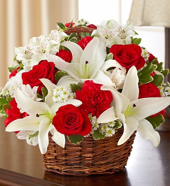 RE002- Graceful red and white arrangement of roses, lilies, alstroemeria, carnations, mini carnations and monte casino, accented with variegated pittosporum and myrtle. Hand-arranged in a willow handled basket with a pair of peaceful white dove picks; basket measures 8H. Appropriate to send to the home of friends and family members or to the memorial service