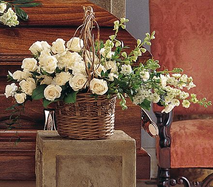 BL001- Representing humility and reverence, white flowers convey modest beauty. Our wicker basket arrives filled with a mix of white blooms to express thoughtful sentiments. One wicker basket with handle arrives filled with white carnations, larkspur and roses. Approximately — 30 W x 28 H.