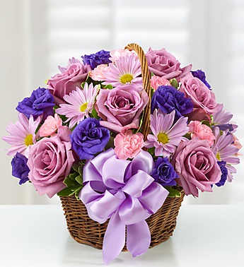 105644- Surprise her with a gift in all her favorite colors! Our beautiful arrangement is filled with roses, lisianthus and daisies in rich shades of purple and lavender. Hand-designed in a charming handled basket and accented with a satin ribbon, it’s sure to give her the smile she deserves. We offer FREE delivery with your order and look forward to offering you the best value for your money.